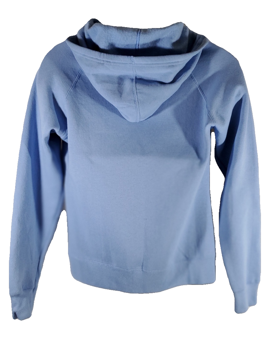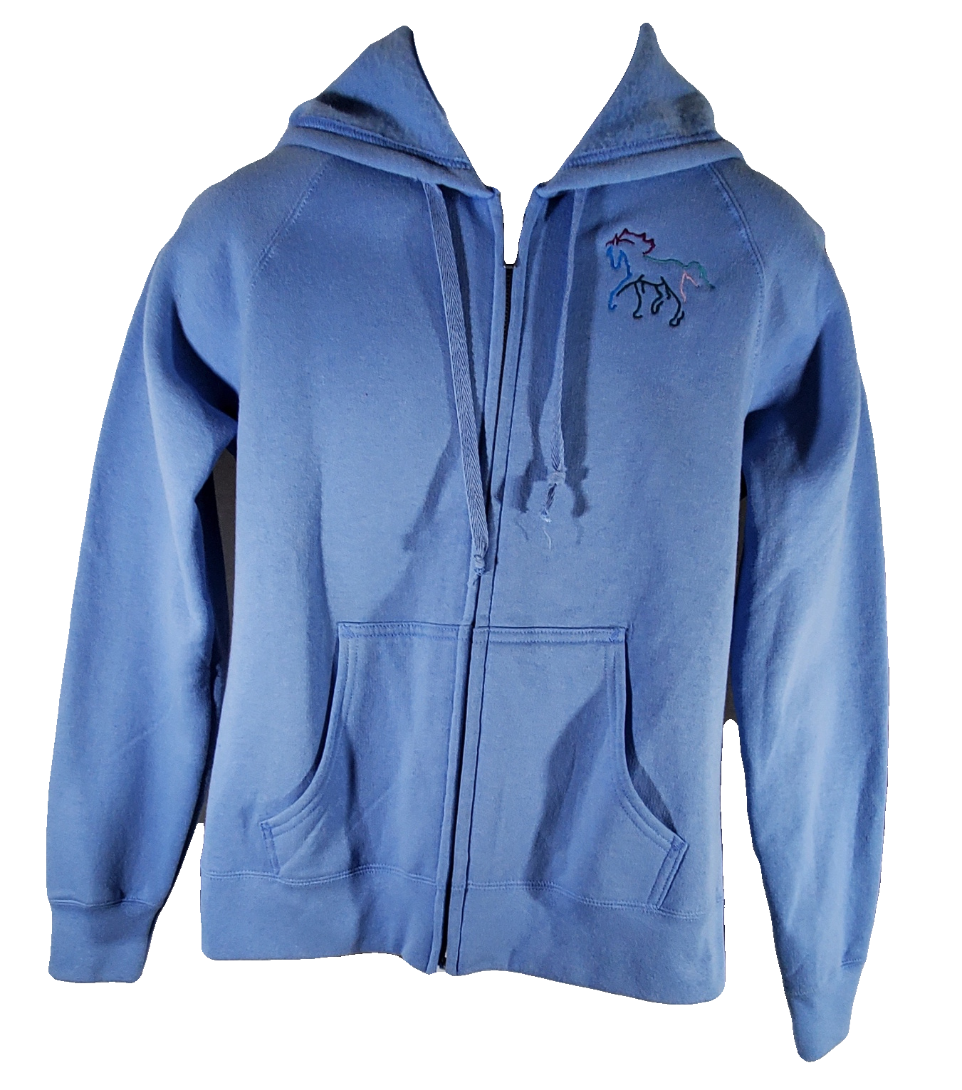 This hoodie sweatshirt is a light blue knit made of 80% cotton and 20% polyester. The hooded sweatshirt is long sleeve with full zipper and ribbed bottom and cuffs. The left side is embroidered with the outline of walking horse. Embroidery is done with washable polyester thread. Size medium.